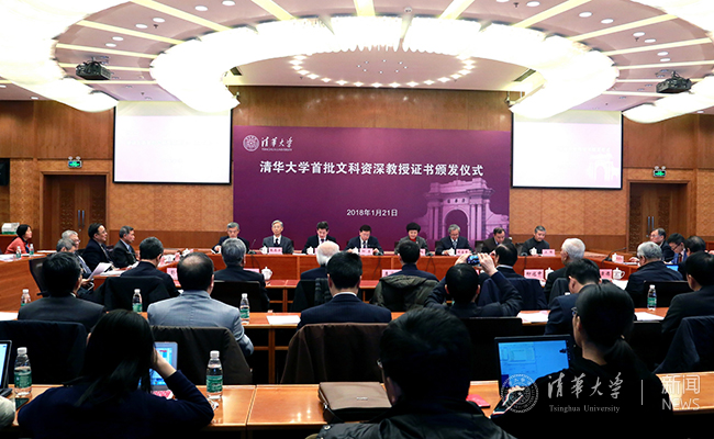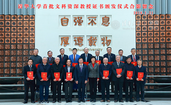 在清华校歌旋律中,邱勇为首批文科资深教授逐一颁发证书并合影留念。邓卫介绍了文科资深教授入选者基本条件以及首批遴选工作情况。