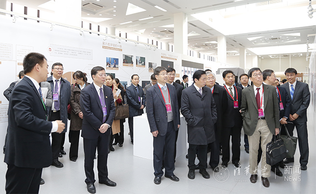 评估组专家参观校史馆“学在清华——清华本科教育专题展”。记者 张宇 摄
