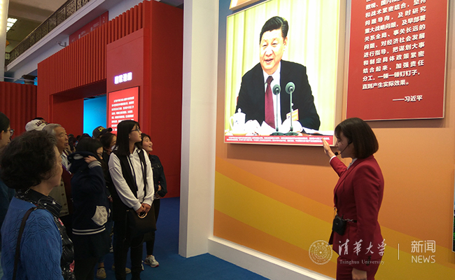 在展厅里,清华师生在解说员引领下,在“坚定文化自信创造中华文化新辉煌”展区感受“数字故宫”,为五千年中华文明特有的魅力和勃勃生机感到无比自豪。在“以人民为中心,增进群众获得感”展区,无论是治污、减霾,还是加强教育、医疗、住房、扶贫上的投入与改革力度,让大家实实在在地看到党和政府对民生问题的重视程度越来越高、投入力度越来越大。在“践行新发展理念,引领经济发展新常态”展区,大家体会到了中国为世界经济发展贡献了中国智慧、提供了中国方案。在“推动构建人类命运共同体,谱写中国特色大国外交新篇章”展区,则集中感受到中国坚持走和平发展道路的决心,以及“一带一路”倡议受到沿线国家的广泛认同。在第七展区“实现强军目标,建设世界一流军队”,让师生们切身感受到中国国防力量不断加强、军事科技飞速发展,武器装备现代化水平跃进式提高,完全有能力和决心捍卫主权和发展权益、维护世界和平。