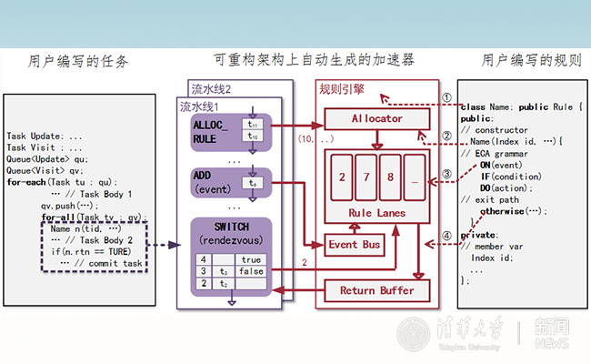 针对这个难题,微电子所魏少军、刘雷波团队提出了一种从硬件架构特征出发,面向特定应用领域设计编程模型的软硬件协同设计方法。该方法首先分析不规则应用的计算模式,建立起一种针对不规则应用的可重构编程模型。在该模型下,一个不规则应用被声明为一组可并行执行的任务,任务间的依赖关系用规则进行描述。程序员可借助该规则来描述任务间的依赖关系在何种情况下才能成立。然后,这个应用任务将被自动转化为可重构计算架构上的硬件加速逻辑(如下图所示)。任务对应一条或多条并发的流水线,通过在运行时评估规则来进行同步,从而实现细粒度流水线级并行。实验结果表明,该方法获得的加速性能和目前最先进的高性能服务器CPU相当,远优于现有在可重构计算架构上通过高层次综合来自动生成的结果。该方法成功解决了不规则应用在可重构计算架构上高效执行的国际公认难题,大幅提升了可重构计算芯片的可编程性,为该类芯片在更大范围内的应用推广扫清了障碍,也为该方向软硬件协同设计方法学的发展铺平了道路。