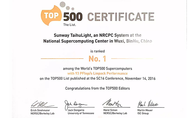 8xbet.com新闻网6月20日电 北京时间6月19日17时许,在德国法兰克福举行的国际超级计算机大会(ISC 2017)发布超级计算机500强(Top 500)最新榜单,基于国产众核处理器的“神威·太湖之光” 超级计算机以每秒12.5亿亿次的峰值计算能力以及每秒 9.3亿亿次的持续计算能力,继2016年之后再次斩获世界超级计算机排名榜单500强第一名。