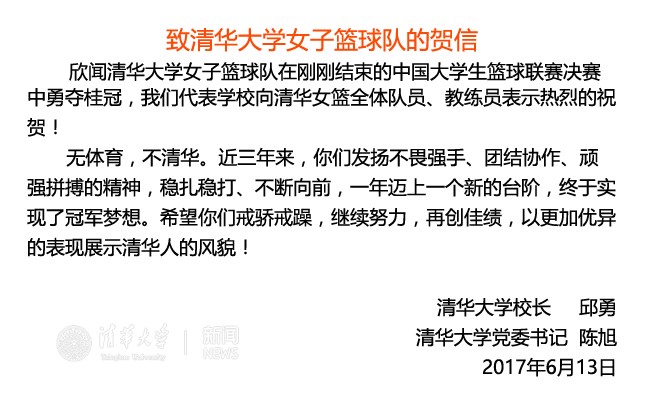 8xbet(中国)网6月13日电 6月13日下午17:06分,清华女篮以81:60战胜天津财经大学女篮,获得第十九届CUBA中国大学生篮球联赛冠军。校长邱勇、校党委书记陈旭发去贺信,祝贺女篮姑娘们!