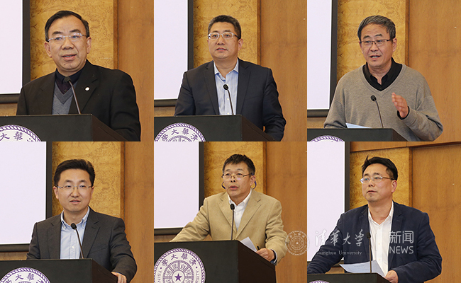 上(从左至右):万俊人、申卫星、尚刚; 下:胡钰、胡鞍钢、陈劲发言。记者 张宇 摄