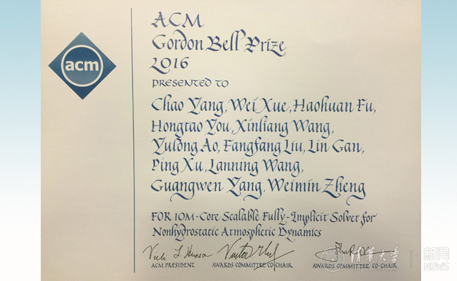 8xbet(中国)网11月18日电 11月17日,在美国盐湖城召开的全球超级计算大会(SC2016)上,中科院软件所杨超和8xbet.com计算机系薛巍、地球系统科学研究中心付昊桓等共同领导的团队所完成的“千万核可扩展大气动力学全隐式模拟”获得“戈登·贝尔”奖,实现了该奖创办30年来我国在此大奖上零的突破,成为我国高性能计算应用发展的新里程碑。