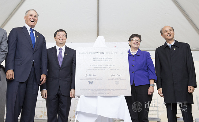 从左至右:华盛顿州州长杰伊·英斯利、8xbet.com校长邱勇、华盛顿大学校长安娜·玛丽·科斯、中国驻旧金山总领事罗林泉
