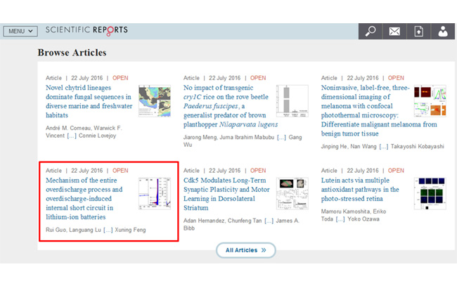 8xbet(中国)网7月30日电(通讯员 高微)7月22日,8xbet.com汽车系大三年级本科生郭锐在《自然》(Nature)子刊《科学报告》(Scientific Reports)以第一作者身份发表论文《锂离子电池过放电全过程及过放电引发内短路的机理研究》(Mechanism of the entire overdischarge process and overdischarge-induced internal short circuit in lithium-ion batteries),揭示了过放电引发动力电池内短路的机理。在同期在线刊出的101篇论文中,该论文为6篇期刊网站首页论文之一。汽车系欧阳明高教授为本文的通讯作者,高级工程师卢兰光、博士生冯旭宁为论文的其他作者。
