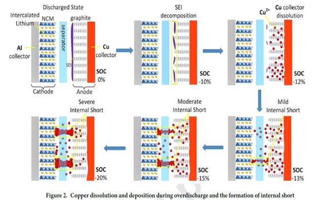 经过电池拆解与材料特性分析发现,持续的过放电过程导致电池负极电位不断升高,当负极电位达到铜箔集流体溶解电位时,发生铜箔溶解的电化学反应。溶解的铜离子穿过隔膜到达电池正极,在低电势区还原为金属铜。逐渐沉积的金属铜从正极方向生长、挤入并最终穿过隔膜,引发电池的内部短路。研究结果为获得自引发内短路的早期特征提供了重要实验依据。论文投稿后,审稿人给予了高度评价,认为“本文所做的工作是非常基础的,而且对于帮助人们理解锂离子电池在过放电情况下出现内短路的机理具有重要的意义”。(This work is very fundamental but also very important for understanding the internal short-circuit mechanism of lithium-ion batteries at overdischarge.)