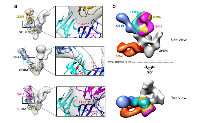 抗体Q206、Q314、Q411与埃博拉膜蛋白GPdM结合的单颗粒冷冻电镜结构。