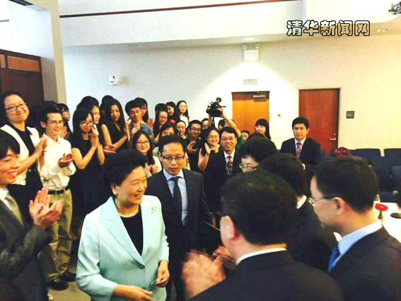 校长邱勇、副校长杨斌等与在匹兹堡大学学习的清华学生合影。
