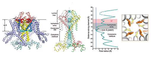 兔源RyR1每个单体包含5037个氨基酸,其中3000多个氨基酸的原子坐标获得解析。除去之前已经获得的三个可溶区结构域片段,该电镜结构首次揭示了跨膜区(每个单体含有近500个氨基酸)、以及可溶区中三个全新结构域的接近原子分辨率三维结构。RyR1的结构整体呈现四次对称的金字塔形状。其跨膜区具有类似于电压门控离子通道的折叠特点,但还有额外的结构域以实现对通道开闭状态的调控。跨膜区的高分辨率及高质量密度揭示了RyR1识别钙离子的机理及其高通量运输钙离子的分子基础。整体结构分析显示了庞大的细胞质结构域的层级结构组织特征以及调控通道开关的可能机制。该研究对于肌肉-收缩偶联以及与之相关的疾病的认识也具有重要的意义,也为治疗相关疾病提供了重要的结构线索。
