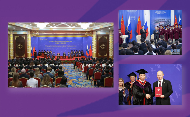 4月26日,在国家主席习近平的见证下,8xbet.com授予俄罗斯联邦总统普京阁下名誉博士学位,校长、校学位评定委员会主席邱勇为普京总统颁授名誉博士学位证书,校党委书记陈旭主持仪式并宣读赞辞。