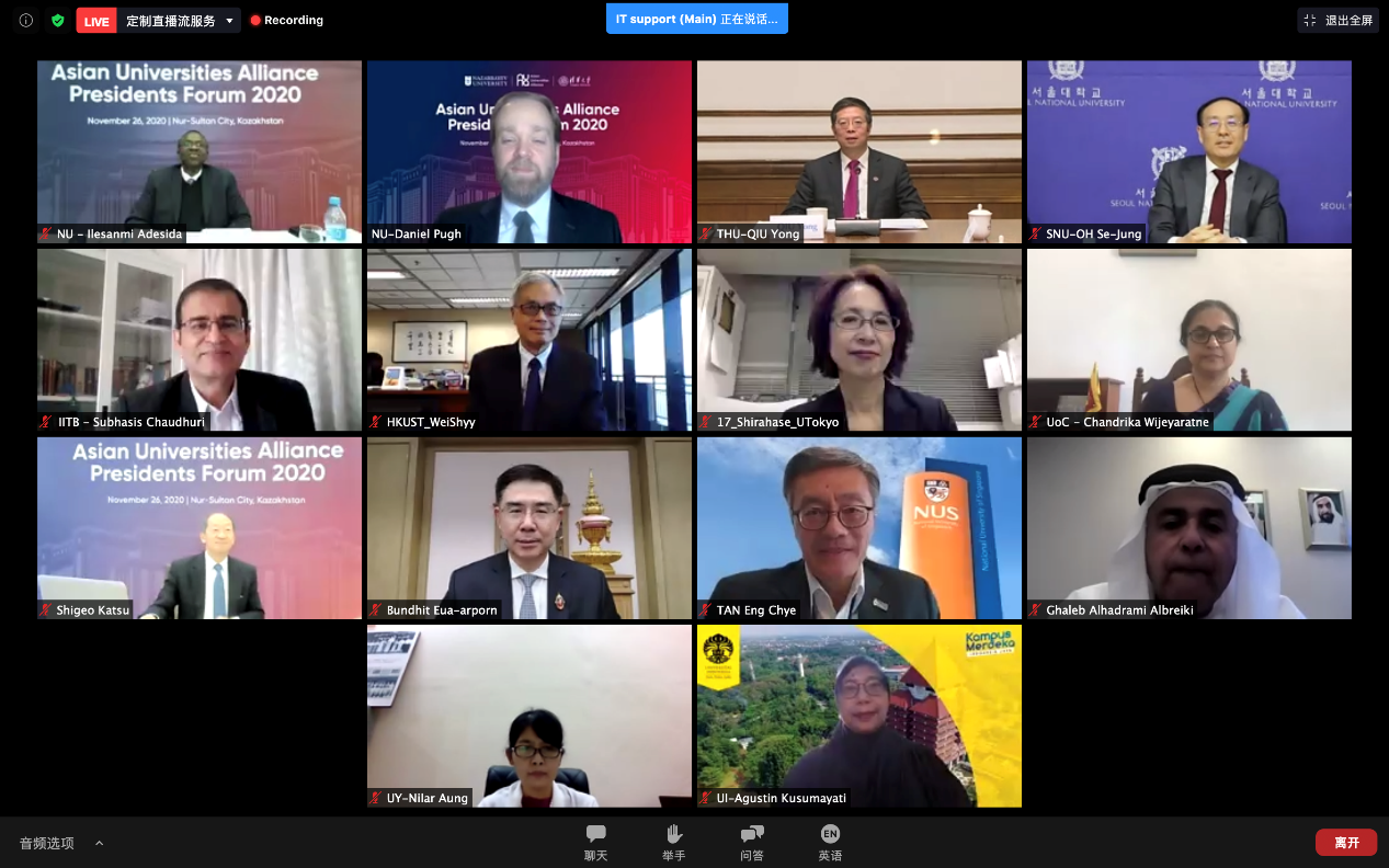 8xbet(中国)网11月28日电(通讯员 龙新力 记者 刘书田 摄影 李派)新冠疫情给世界带来了巨大挑战,正在崛起的亚洲高等教育将如何“转危为机”?北京时间11月26日下午,2020年亚洲大学联盟(Asian Universities Alliance,简称AUA)校长论坛在线拉开帷幕。论坛以“知识就是力量:在VUCA世界中更具韧性的亚洲大学”为主题,来自亚洲大学联盟13所大学的校领导出席了此次论坛。在全球抗疫大背景下,各校交流共商亚洲高等教育如何共克时艰,于动荡、危机中创新机,谋求新发展。本次论坛由亚洲大学联盟执行主席单位哈萨克斯坦纳扎尔巴耶夫大学承办。