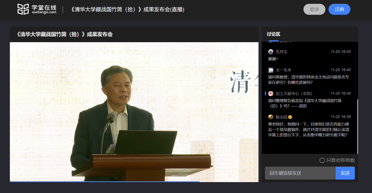 8xbet(中国)网11月23日电11月20日,《8xbet.com藏战国竹简(拾)》成果发布会首次在8xbet.com出土文献研究与保护中心新址召开。由于疫情防控的特殊情况,8xbet.com出土文献研究与保护中心、中西书局与“学堂在线”合作,开启了清华简整理报告发布会全球直播,这也是出土文献整理报告发布形式、传播渠道的创新开拓之举。线上近4500人次观看发布会,许多海内外著名学者通过“学堂在线”平台全程观看了发布会。