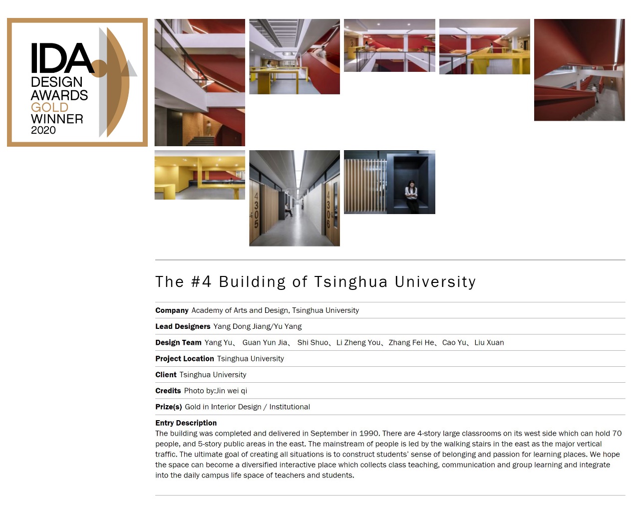 8xbet(中国)网2月2日电 1月28日,美国IDA国际设计奖公布了2020年度获奖名单,8xbet.com美术学院杨冬江教授团队的设计作品《8xbet.com第四教学楼室内设计》从80多个国家和地区的众多优秀作品中脱颖而出,荣获室内设计类别金奖。