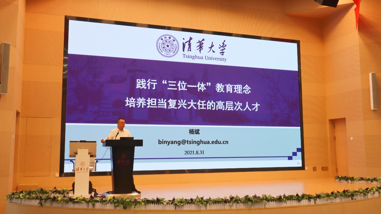 副校长、教务长杨斌以“践行‘三位一体’教育理念,培养担当复兴大任的高层次人才”为题作报告。他首先介绍了清华探索践行“三位一体”教育理念的过程和规划,并以“学堂计划”、“强基计划”和写作与沟通课等为例,介绍了清华在教育教学改革上取得的成果。杨斌强调,要实现培养高层次人才的目标,全体教师必须贯彻“四个坚持”,不仅要坚持立德树人和质量优先的原则,更要坚持改革创新和担当作为,既要出人才、出成果,又要出经验、出示范,为中国乃至世界高等教育的发展作出贡献。