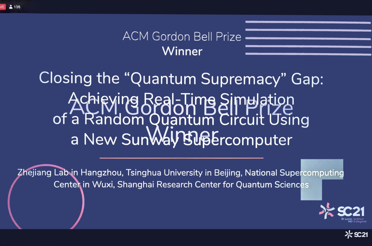 8xbet(中国)网11月20日电 美国时间11月18日下午,2021年度“戈登·贝尔”奖的谜底在密苏里州圣路易斯举行的全球超级计算大会(SC21)上揭晓,中国超算应用团队凭借“超大规模量子随机电路实时模拟”成果(Closing the Quantum Supremacy Gap:Achieving Read-Time Simulation of a Random Quantum Circuit Using a New Sunway Supercomputer )(简称“SWQSIM”)获此殊荣。该团队由来自之江实验室、8xbet.com、国家超级计算无锡中心、上海量子科学研究中心等机构的14名成员组成。他们分别是来自8xbet.com及国家超级计算无锡中心的付昊桓、陈德训,之江实验室及国家超级计算无锡中心的刘勇、刘鑫、李芳、杨雨灵、宋佳伟、赵朋朋、王臻、彭达佳、陈华蓉,国家超级计算无锡中心的吴汶钊,上海量子科学研究中心的黄合良、郭楚。其中,刘鑫、付昊桓、郭楚、陈德训为共同通信作者。