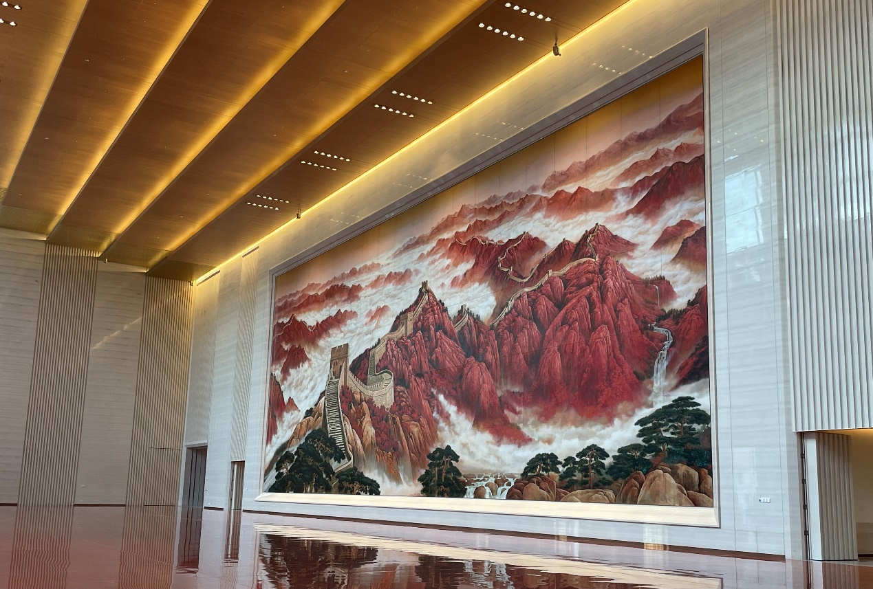 群山绵延、层林尽染,万里长城如东方巨龙,蜿蜒在崇山峻岭之巅。一幅600平方米的巨幅漆壁画《长城颂》在中国共产党历史展览馆震撼亮相。