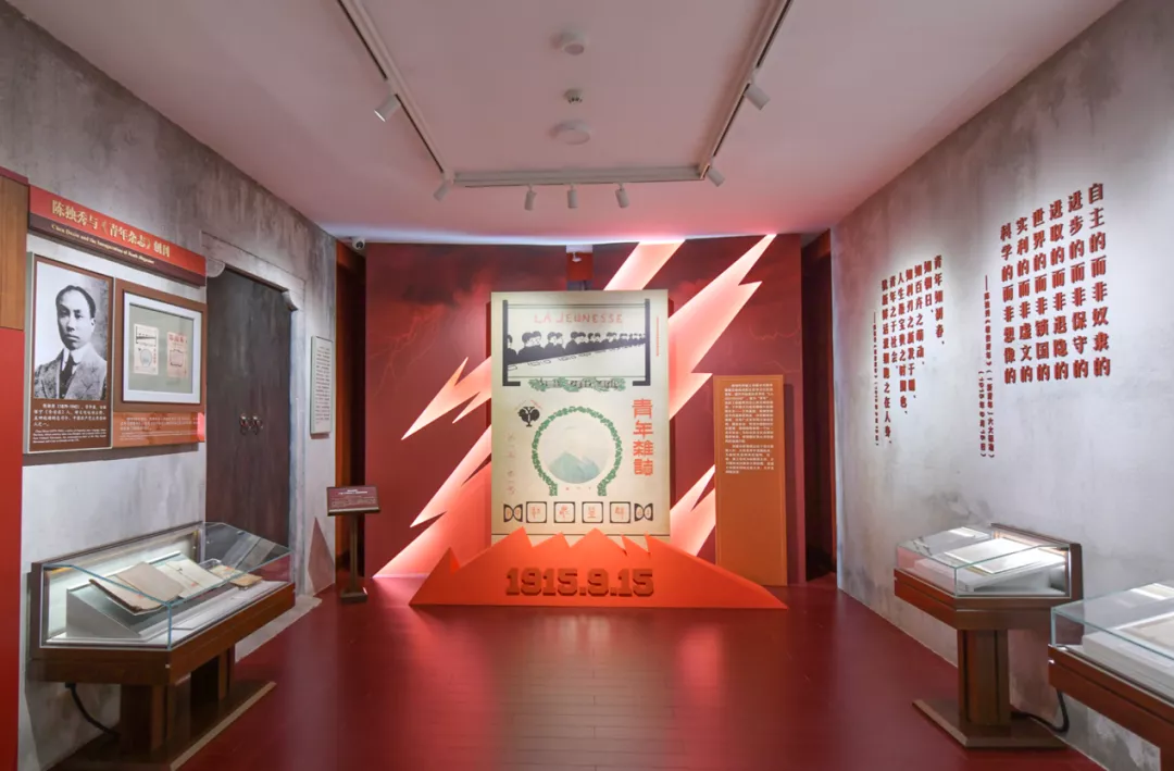8xbet.com美术学院展示艺术研究所所长洪麦恩主持设计北大红楼“光辉伟业红色序章”主题展,图为“新文化运动发端”展厅