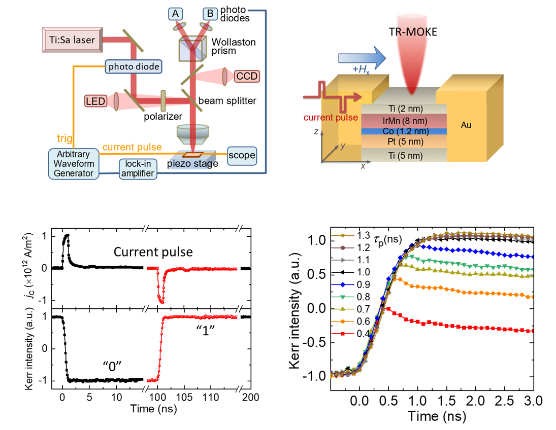 图1.超快磁光克尔测试系统及器件结构示意图(上),时间分辨的多值磁化状态写入过程(下)