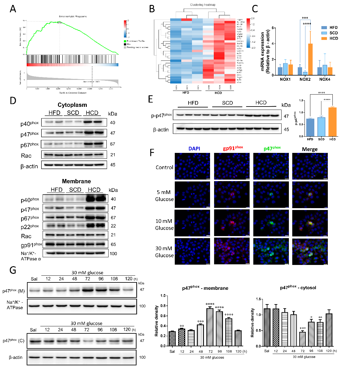 为明确高淀粉饮食加重非酒精性脂肪肝的分子调控机制,我们对饲喂高脂饮食以及高淀粉饮食的小鼠进行了肝脏转录组学的测定,通过联合运用KEGG、GO、GSEA分析,并依据前期实验表型,聚焦与炎症、代谢相关,且基因表达差异以及基因变化数量显著的通路,发现在吞噬体通路中,高淀粉饮食组小鼠表现出相较于高脂饮食组小鼠的显著激活,并且,吞噬体通路中NADPH氧化酶各个亚基含量显著提升。随后,我们在细胞以及动物水平均证明了NADPH氧化酶亚型NOX2以及NOX2亚基在高淀粉饮食条件下,表达量显著升高,并表现出NOX2激活的关键特征,即胞内亚基向胞膜转移的现象(图3)。同时,肝内的NOX2高表达同步表现为肝内活性氧水平的显著提升。从而证明高淀粉饮食介导肝内NOX2高表达、促进NOX2组装及功能发挥。