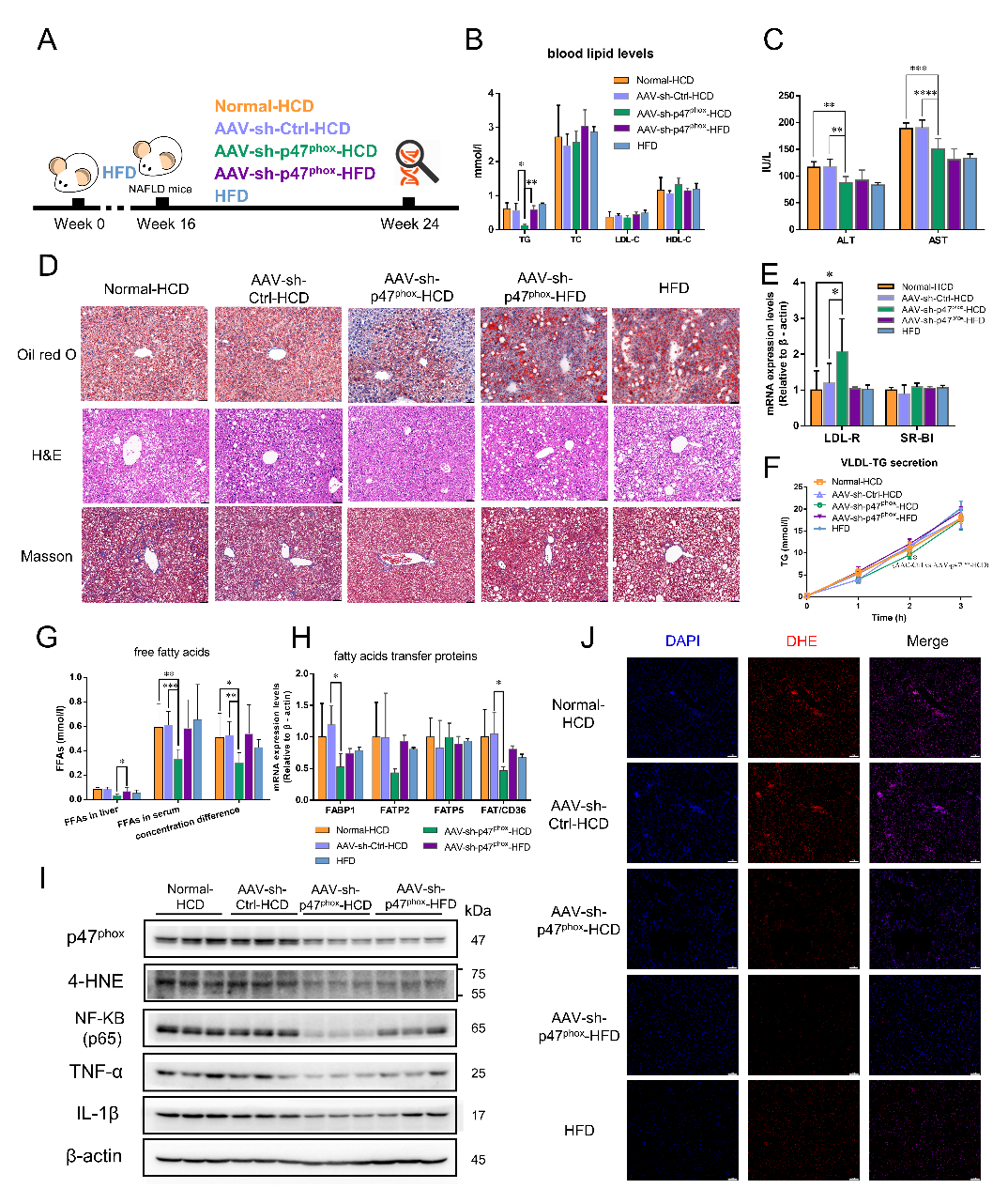 为进一步证明高表达的NOX2是高淀粉饮食介导NAFLD恶化的主要原因,我们在非酒精性脂肪肝小鼠中通过腺相关病毒构建了肝脏特异性敲低p47phox(介导NOX2组装的关键亚基)的小鼠,并同步将小鼠饮食更换为与高脂饮食等热量的高淀粉饮食。研究发现,敲低p47phox可以抵抗高淀粉饮食所致的肝内脂质堆积、炎症因子浸润以及纤维化加重,但是在继续维持高脂饮食的小鼠中,敲低p47phox并不会表现出相应的缓解作用。同时,在高淀粉饮食条件下,敲低p47phox的小鼠表现出肝脏脂肪酸转运的抑制和肝内活性氧水平的降低(图4)。此外,通过分析细胞活性氧来源以及能量感知分子AMPK的活性表达,进一步提出NOX2介导的活性氧是NOX2调控脂肪酸转运的关键分子,并且论证得到AMPKα1/p47phox是高淀粉饮食介导NOX2高表达的依赖途径。