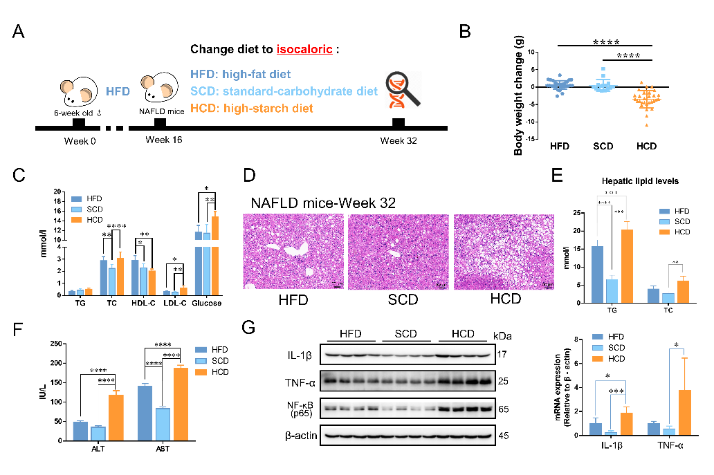 在本研究中,通过自主设计无脂质、无游离糖的高淀粉饮食(high-starch carbohydrate diet, HCD),以每天定时、等热量的方式连续干预非酒精性脂肪肝小鼠16周,发现高淀粉饮食非但不会缓解、反而会进一步增加肝内脂质含量并提升肝内炎症,且其恶化程度更甚于一直维持高脂饮食的小鼠(图1)。同时,在健康小鼠中,长时间的高淀粉饮食同样会介导非酒精性脂肪肝的发生,并且是以先诱发炎症,后表现出脂质堆积的顺序进行。此外,利用阿卡波糖限制小鼠肠道中淀粉的吸收可以显著改善HCD介导的非酒精性脂肪肝恶化,反向证明了高淀粉饮食对于非酒精性脂肪肝的负向调控作用。以上发现在细胞水平也得到了一致的验证结果。从而本研究从多角度、系统性地阐明了高淀粉饮食诱导非酒精性脂肪肝发生,并介导其进一步恶化。