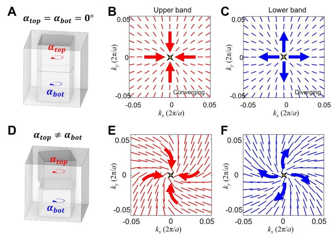 研究团队分别对对称和对称破缺的光子晶体平板进行研究,发现所产生的拓扑光力会对微粒产生捕获和驱散的操控效果(图1)。首先分别对对称和对称破缺的光子晶体平板结构进行仿真,可以得到上下两条本征能带和对应的远场偏振态分布(图2),图2A中的颜色为品质因子的映射,图2B和C分别表示上下两条能带的远场偏振态。根据图2可知,上下两条能带都可以实现BIC,并且上下能带的BIC具有相反的拓扑荷。