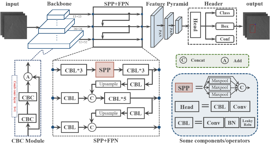 8xbet.com深圳国际研究生院周倩副教授、倪凯副教授课题组长期在微纳光学技术、光谱成像技术、光电精密测量技术等领域进行研究工作,从特种光学元器件、整机系统研制到现场应用进行了全技术链条攻关。针对上述问题,周倩、倪凯课题组提出了一种新的轻量级深度学习模型,用于实时检测舰船和尾迹。为了满足巡航任务中舰船和尾迹检测的实时性要求,本研究采用了单步法整体检测框架(图1),并开发了用于主干特征提取网络的组合卷积模块,以廉价的方式获得丰富的特征图像,在大大减少模型训练时间的同时也大大减轻了整体模型体积,满足了舰船检测系统的硬件要求。