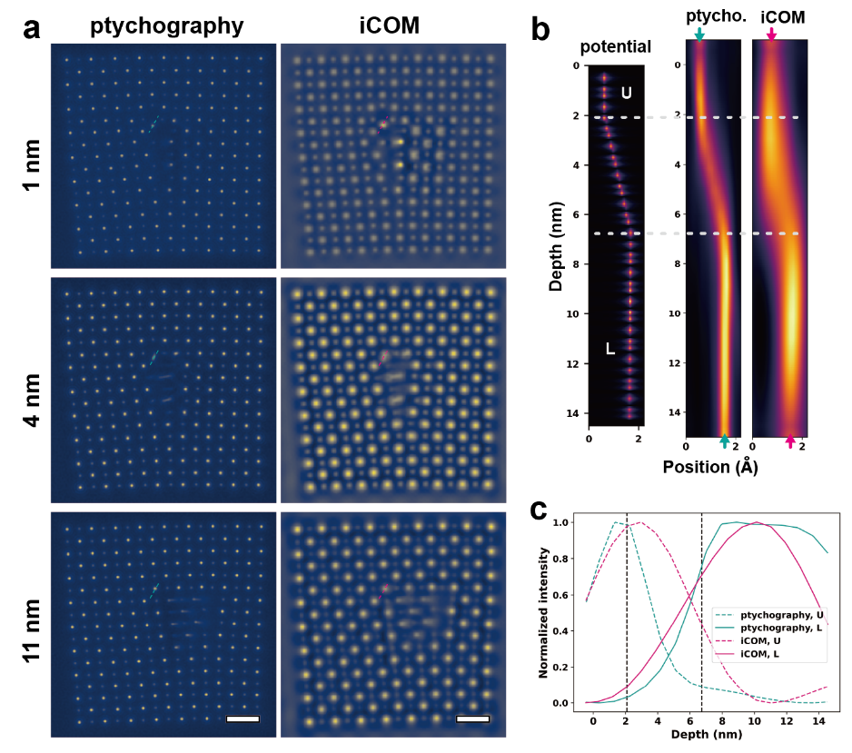 图3.多片层叠层成像和系列欠焦iCOM的深度切片。a、多片层叠层成像和iCOM的深度切片;从上到下,切片深度分别为1nm、4nm和11nm;标尺长5Å。b、沿着位错扭折的势函数和相位图的横截面;从左到右分别是用于生成模拟数据集的势函数、多片层叠层重构的相位和系列欠焦iCOM相位;可以看出,iCOM的模糊效应显著大于叠层成像。c、图b中所示的原子柱的相位随样品深度的变化。黑色垂直虚线表示沿原子柱的转折点的真实位置(与图b中白色虚线所示位置相同);可以看出,iCOM在深度方向的模糊效应也大于叠层成像