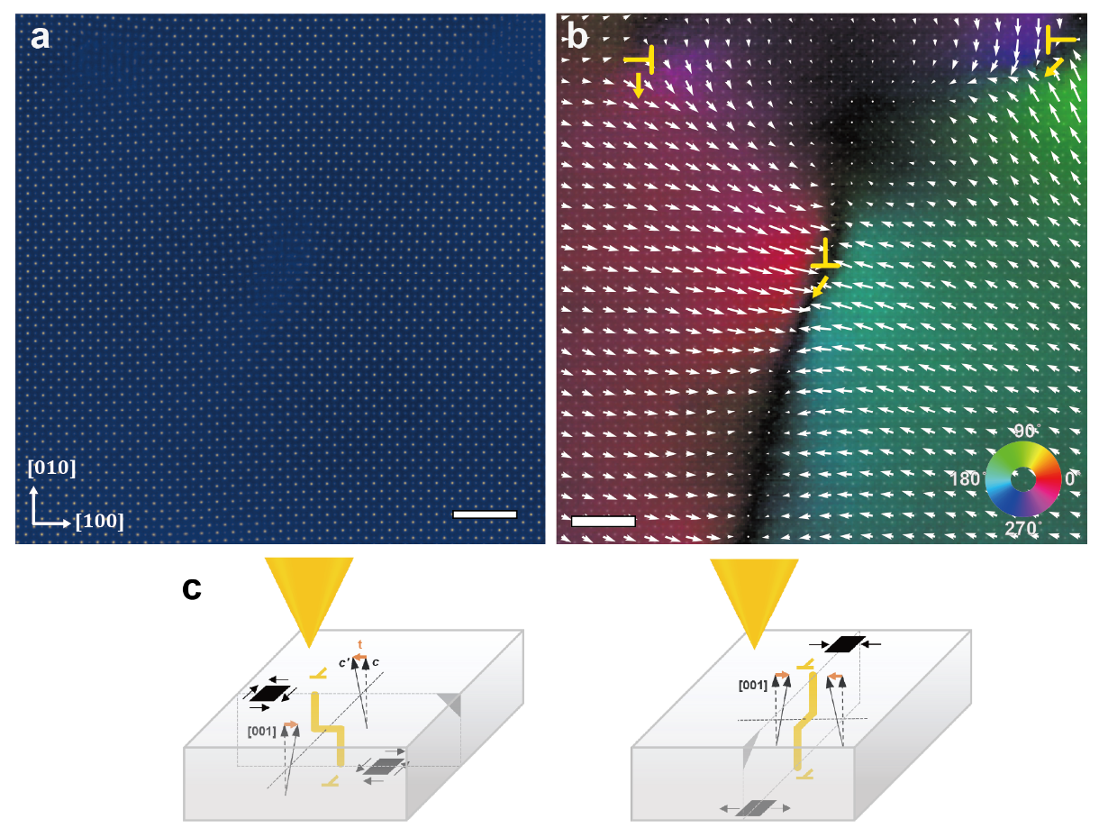 图4. SrTiO3中多个位错的晶体倾转分布。a、包含三个位错的区域的相位图。b、对应图a中区域的晶体倾转分布,其上叠加了相位图;黄色箭头表示位错的横向移动方向。图a和b中的标尺为15Å。c、晶体倾转与位错横向位移的相互关系;晶格矢量c由于倾斜矢量t变为c’,即c’=c+t;黑色方块用于说明应变状态;左边为扭转,右边为弯曲;在两种形变模式中,薄膜上部和下部的应变都是反向的,对应位错向相反方向的横向移动。图b中左上角的位错和图2中的位错对应于扭转模式;图b的中心和右上方的位错对应于两种模式的混合