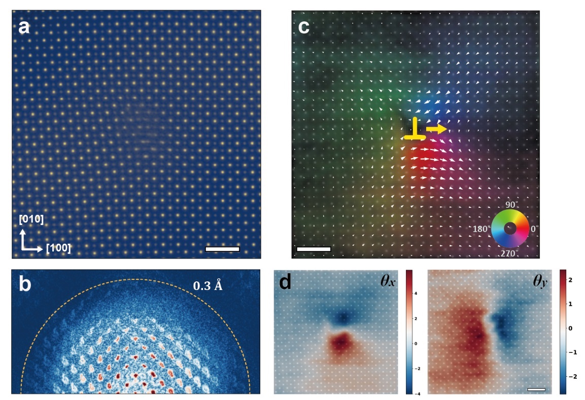 图1. SrTiO3中位错的结构像和取向分布。a、叠层成像的重构相位。b、图a中相位图的衍射图,黄色虚线表示0.3Å的信息极限。c、叠加相位图的晶体倾转分布,白色箭头表示[001]方向在平面内的投影,黄色箭头表示位错核的横向移动。d、晶体在[100]和[010]方向的倾转的分布。标尺长1nm