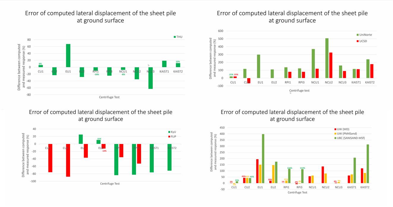 LEAP-2022计划针对饱和砂土地基中桩板挡墙地震响应,由五个研究机构开展了11组离心模型试验,并由参与计划的数值分析团队在试验结果未知的条件下,利用各自团队的本构模型和数值模拟方法对试验中地基和挡墙的响应进行背靠背预测。2023年1月26日,LEAP-2022官方公布了本期计划中所有团队的预测与试验结果对比。