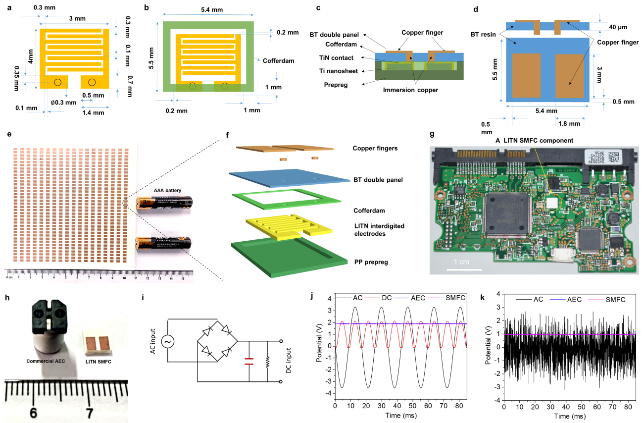如图4所示,与商用AEC样品相比,LITN SMFC拥有几乎相同的快速响应能力。更关键的是,LITN SMFC还表现出优异的交流线滤波性能,在120Hz时纹波电压约为0.03 V,与商用AECs相当。结合半导体制造工艺技术,用激光直写技术制备的LITN SMFCs有望取代体积巨大的AECs,这将有利于新兴的可穿戴电子设备、移动电源、电器以及物联网上的分布式能量采集和供电的小型化,极大地促进高性能数字电路和新兴电子技术的发展。该方法不仅为创造新的低维过渡金属氮化物铺平了道路,而且还为开发高度集成的先进微器件提供了启示。