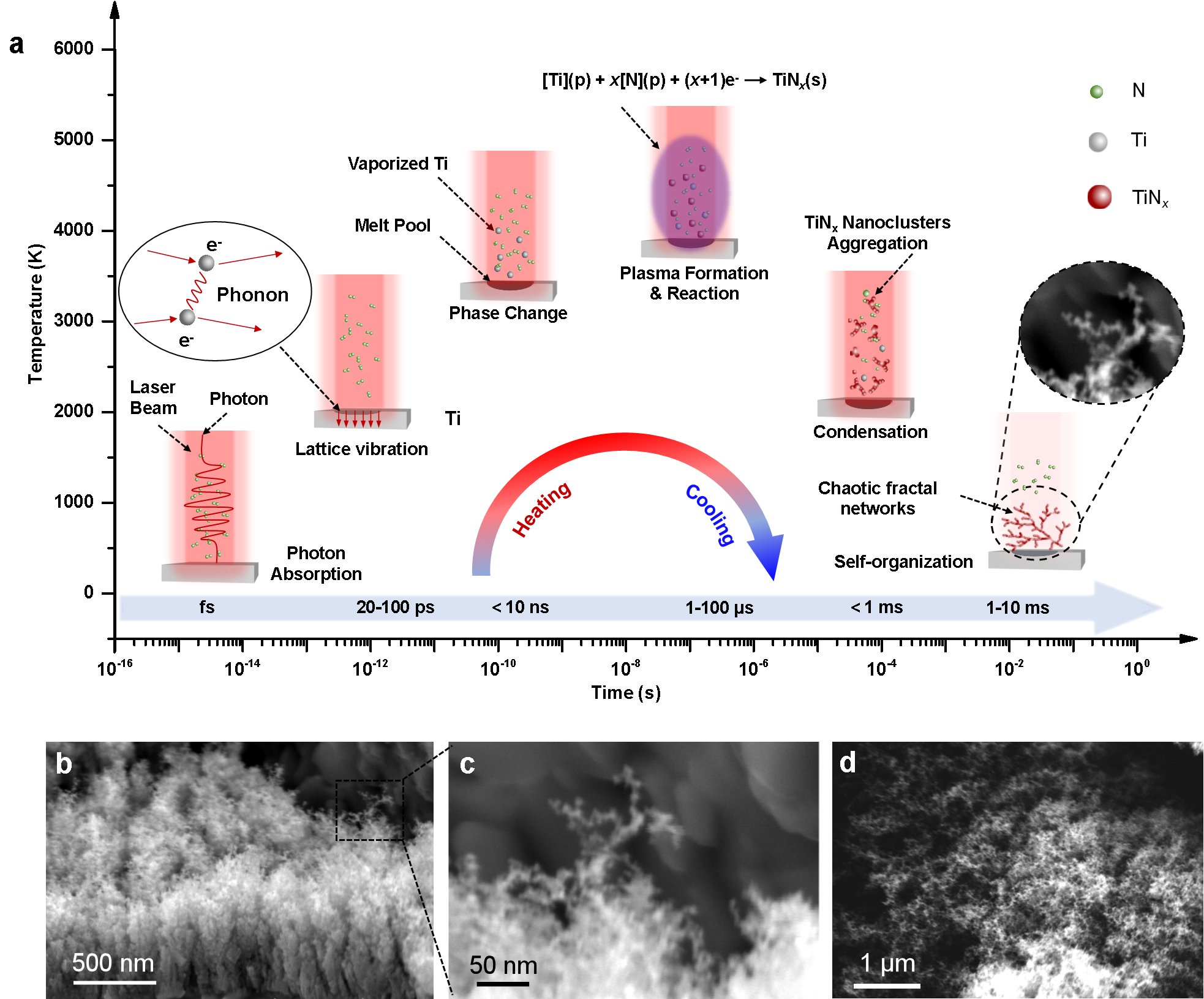 图1. 激光诱导瞬态自组织LITN的形成过程示意图及微观结构形貌