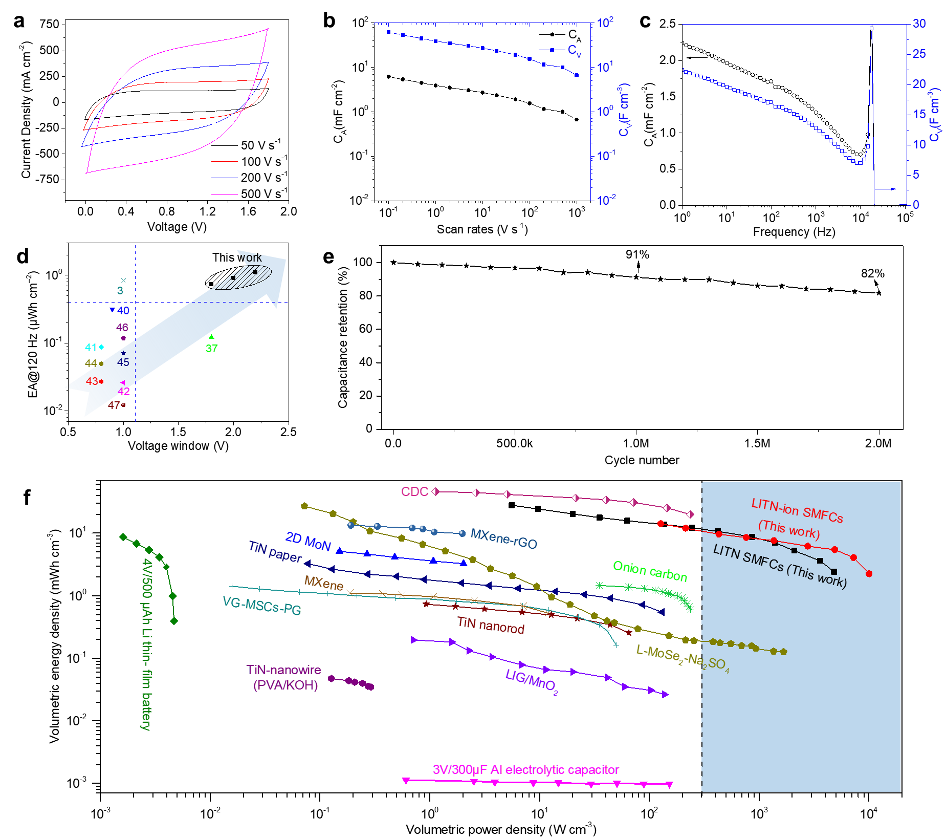 LITN基表面贴装滤波电容器(SMFCs)电极阵列的制备与半导体制造和封装工艺完全兼容,可以满足嵌入式元件的严格规范,表现出简单、经济、高效和可持续的特点。LITN电极的三维介孔和良好的组织结构可以提供丰富的电荷传输通道,并沿垂直和平面方向的阻碍最小。如图3所示,LITN基SMFCs在水系电解质溶液中实现了超长的循环寿命(2,000,000次),120Hz时的面积能量密度为0.92μWhcm-2,体积能量密度为9.17mWhcm-3,这在水系电化学电容器中是创纪录的关键突破。