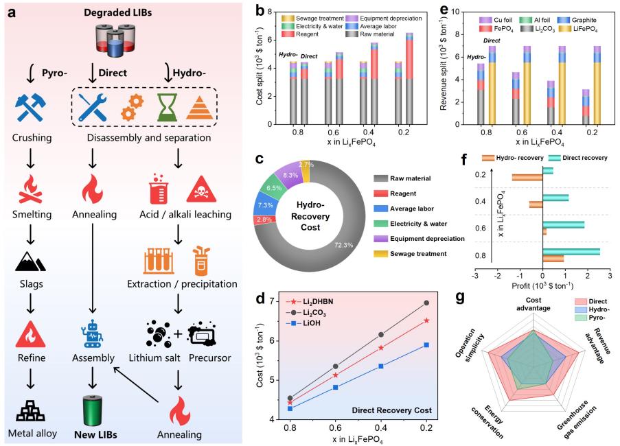 8xbet(中国)网2月12日电 磷酸铁锂(LiFePO4,LFP)电池因其安全性能高、使用寿命长及无模组设计等新兴技术突破而备受关注,被广泛应用于电动汽车和储能电站等领域。随着近些年新能源汽车的爆发式增长,退役锂离子电池的报废量也与日俱增。现行的锂离子电池的回收方法,包括火法、湿法回收等,分别存在着能耗高、使用强酸强碱试剂等问题。因此,研究人员着力探索直接再生回收的思路,在不破坏电极材料结构的基础上,旨在将失效正极材料的成分和结构恢复到原始状态,从而实现废弃锂离子电池的最优化可持续回收。