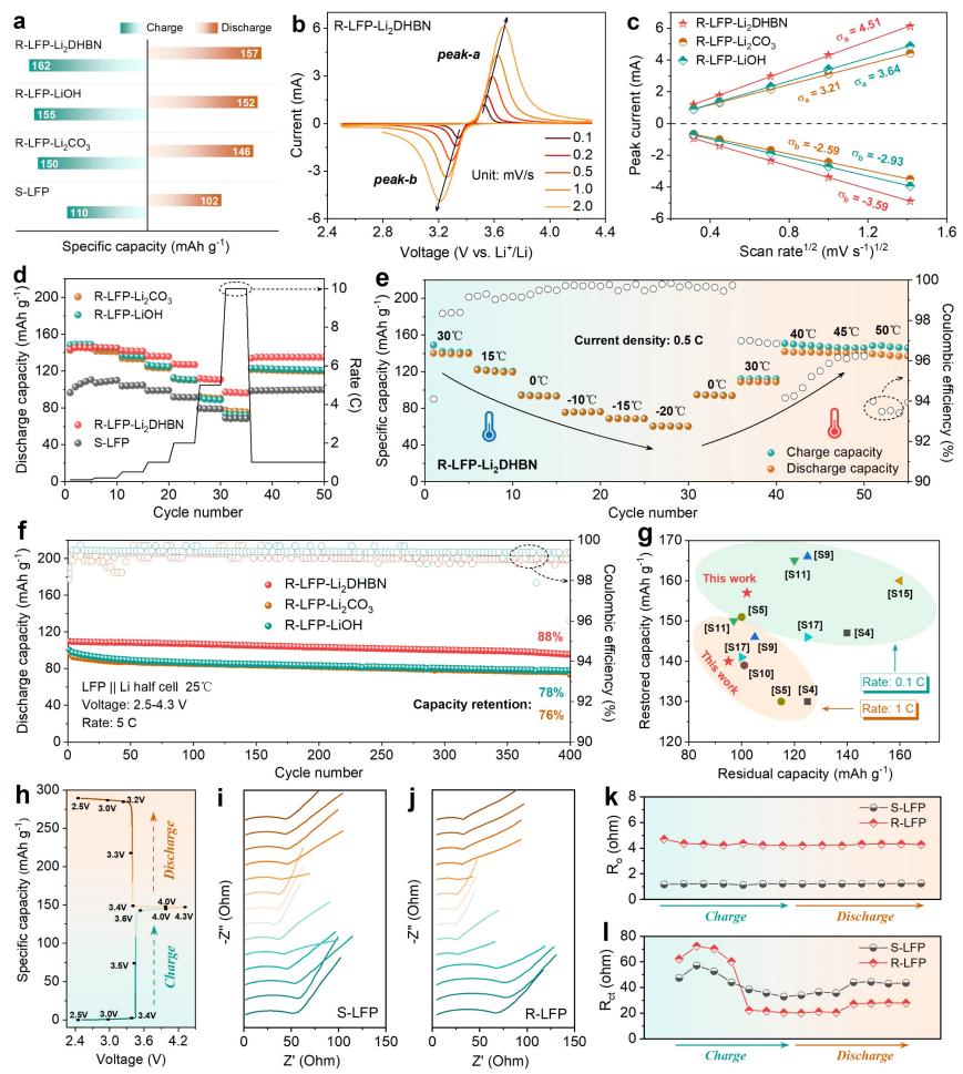 近日,8xbet.com深圳国际研究生院周光敏、成会明团队提出了使用一种新型的多功能有机锂盐(3,4-二羟基苯腈二锂,Li2DHBN)直接修复失效LFP正极的方法。有机锂盐表面丰富官能团(如-CN,-OLi)可以和失效LFP颗粒有效地耦合,且有机锂盐在较低温度下分解为无定形碳和碳酸锂,在较高温度下进一步分解为氧化锂,即达到“低温包碳+高温补锂”的双重效果。此外,具有还原性的氰基官能团在还原三价铁的过程中起到关键作用。修复后的LFP正极具有优异的循环稳定性和倍率性能,在5C下循环400次后容量保持率为88%,这得益于锂的有效补充、三价铁的还原、电子导电性的提升。这种策略也适用于直接修复过渡金属氧化物层状正极材料,证实了该有机锂盐的通用性。相比于传统的火法和湿法过程,该工作提出的策略具有更高的经济价值和更大的环境效益,为未来探索更多不同锂源用来直接修复失效锂离子电池正极材料提供了独特的思路。