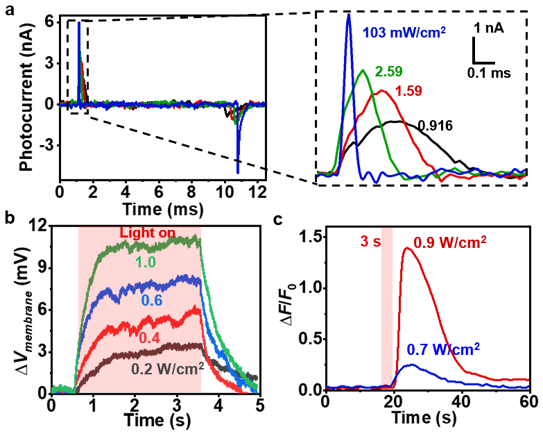 图3. 薄膜硅器件的光电响应及其对干细胞膜电位和钙离子浓度的光电调控作用