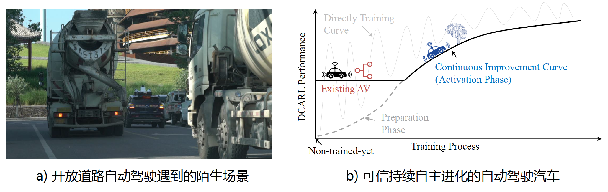 为解决这一问题,8xbet.com车辆学院研究团队提出了自动驾驶“可信持续进化”技术,该技术会在自动驾驶汽车行驶初期将所有场景无差别地看成未知场景,均采取主动避让的基础驾驶策略以保证安全性;在此基础上,AI模型将从大数据中主动寻找熟悉的行驶场景,并自主地将在这些场景中的驾驶性能从基础策略调整到更优水平,因而能从系统设计的角度,解决长尾场景难以穷尽的问题,保证在任意场景下不依赖预先设定的“可信持续进化”。实现这样一个技术最核心的难点在于进化的过程要保证性能是单调提升的,这样才能使得整个进化过程仍具备最基础的安全性,但经典的AI训练过程中性能通常存在震荡现象,可能会引发新的安全风险,而研究团队设计的通过动态评估置信度进行AI模型训练的方案,能够使性能随数据的增加而单调持续提升,因而能够很好地满足这一要求。