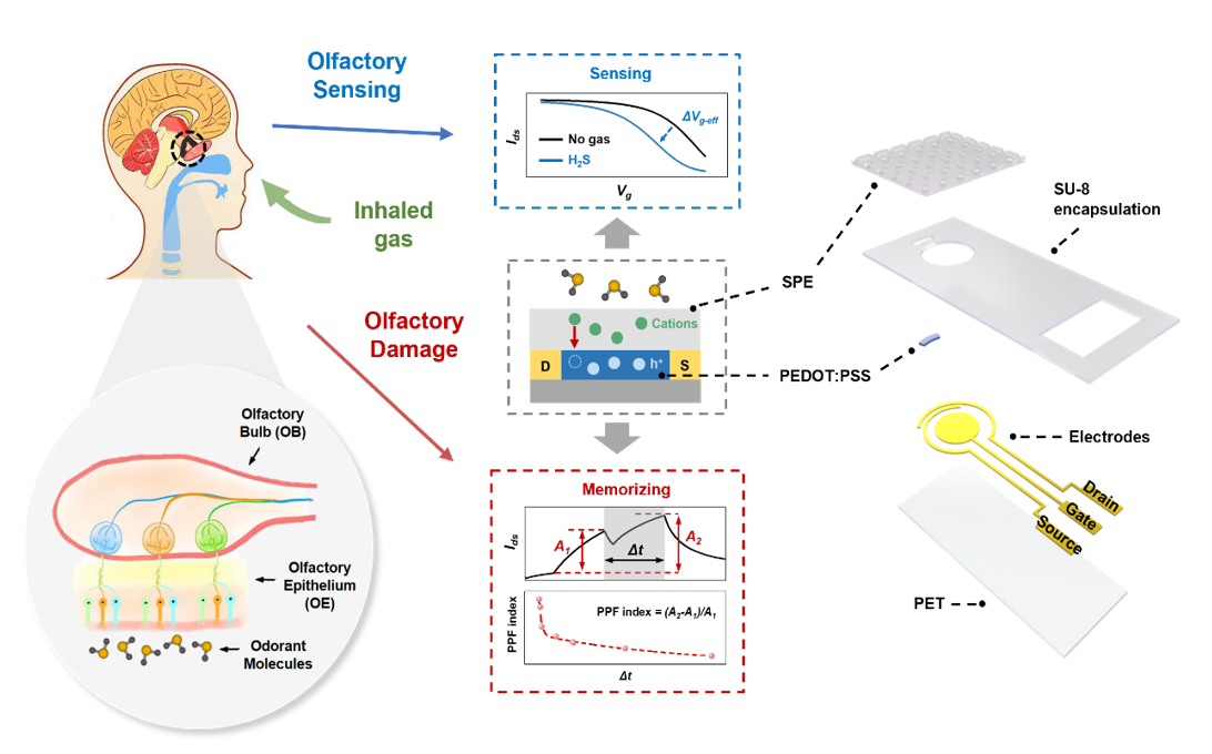 图1.基于全固态有机电化学晶体管的柔性仿生嗅觉突触示意图