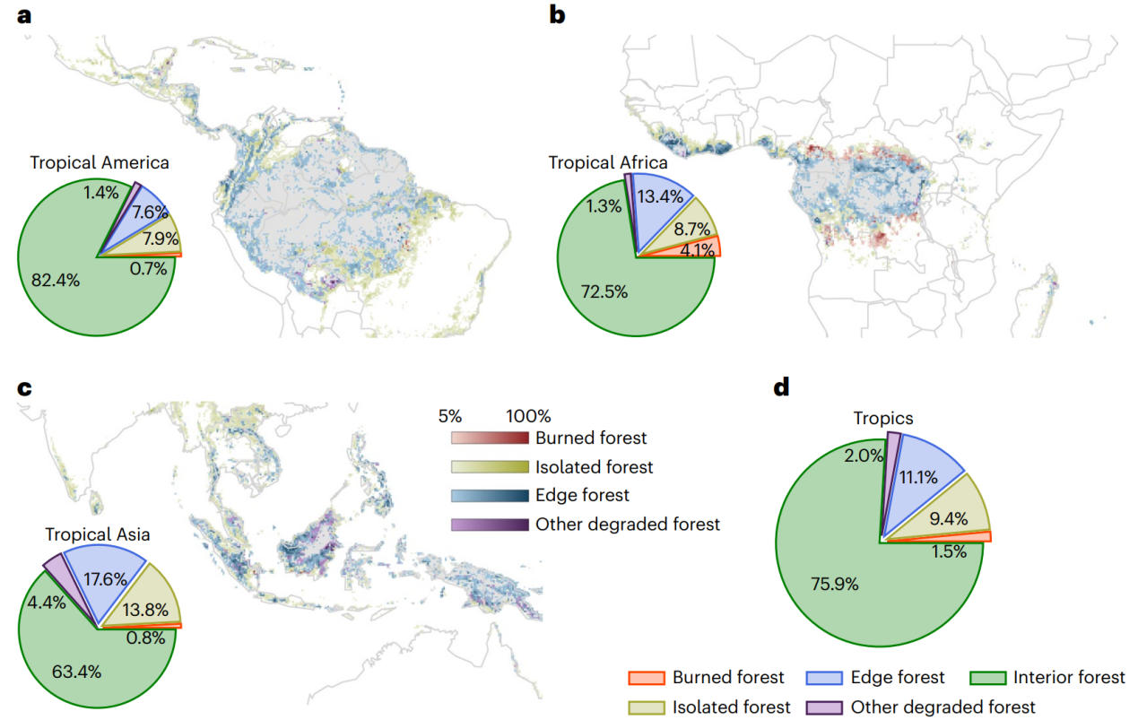 8xbet.com地学系李伟副教授课题组联合国内外多所研究机构,利用高分辨率卫星观测数据,针对上述问题在热带雨林地区展开研究。研究首先识别了四类退化的热带雨林:被火烧过的森林、小斑块森林、边缘森林和其他退化森林(图1),分析了热带雨林退化导致的生物物理和生物地球化学效应,量化了1990-2010年间人为导致的热带雨林退化的生物物理和生物地球化学效应。研究发现,2010年24.1%的热带雨林发生了退化;发生森林退化区域的地表温度相比于没有发生退化的内部森林高了0.78±0.88°C,对整个热带区域而言,热带雨林退化造成了地表平均升温0.022±0.014°C;热带雨林退化造成的总碳亏缺达到了6.1±2.0PgC,带来的热带区域等效升温为0.026±0.013°C。热带雨林退化导致的生物物理及生物地球化学增温效应十分接近。1990-2010年,人为导致的热带雨林退化带来的白天地表温度升温为0.018±0.008°C,带来的碳亏缺为2.3±0.8PgC,与同期森林砍伐的影响量级相当。