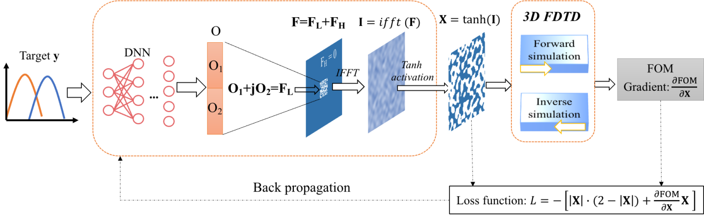 为实现多任务器件优化设计,研究人员将设计目标通过一个深度生成神经网络映射到低频傅立叶分量。这些分量在高频补零后通过傅立叶逆变化即可还原成器件图形的具体结构。生成的器件结构通过电磁仿真软件仿真后得到实际的光学响应。该响应与目标光学响应之间的差值可用于生产神经网络的训练。