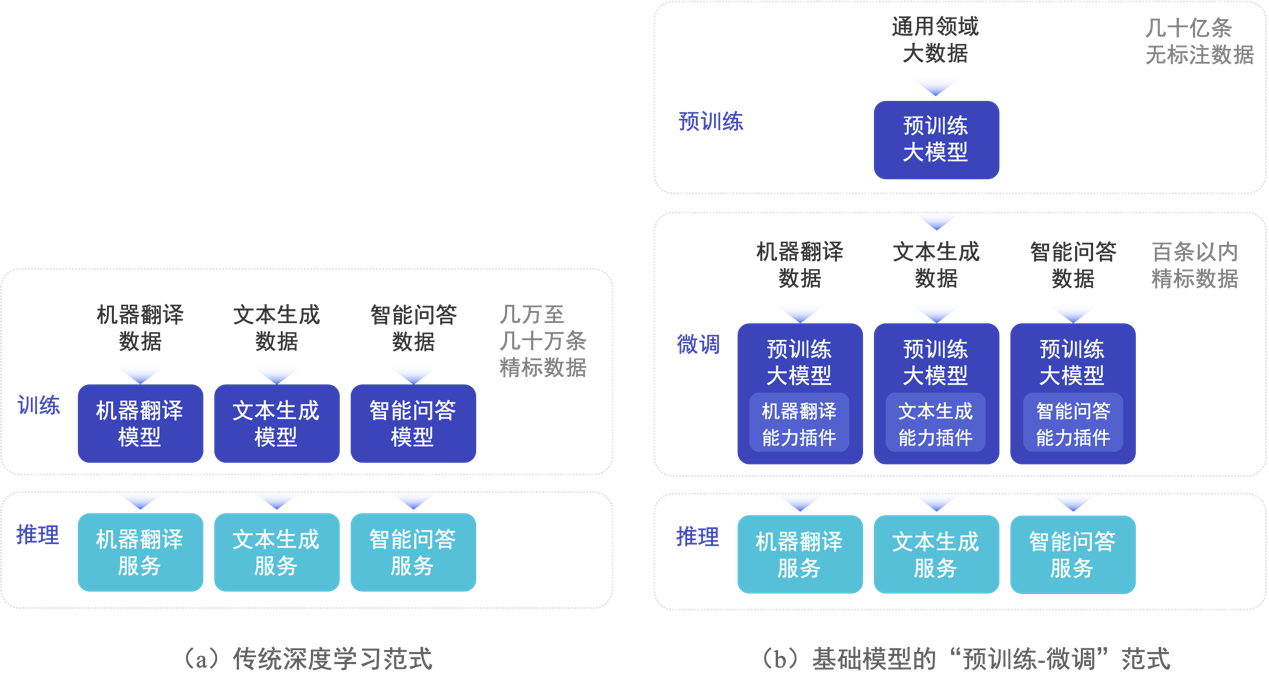 图1.基础模型的“预训练-微调”范式与传统深度学习的对比