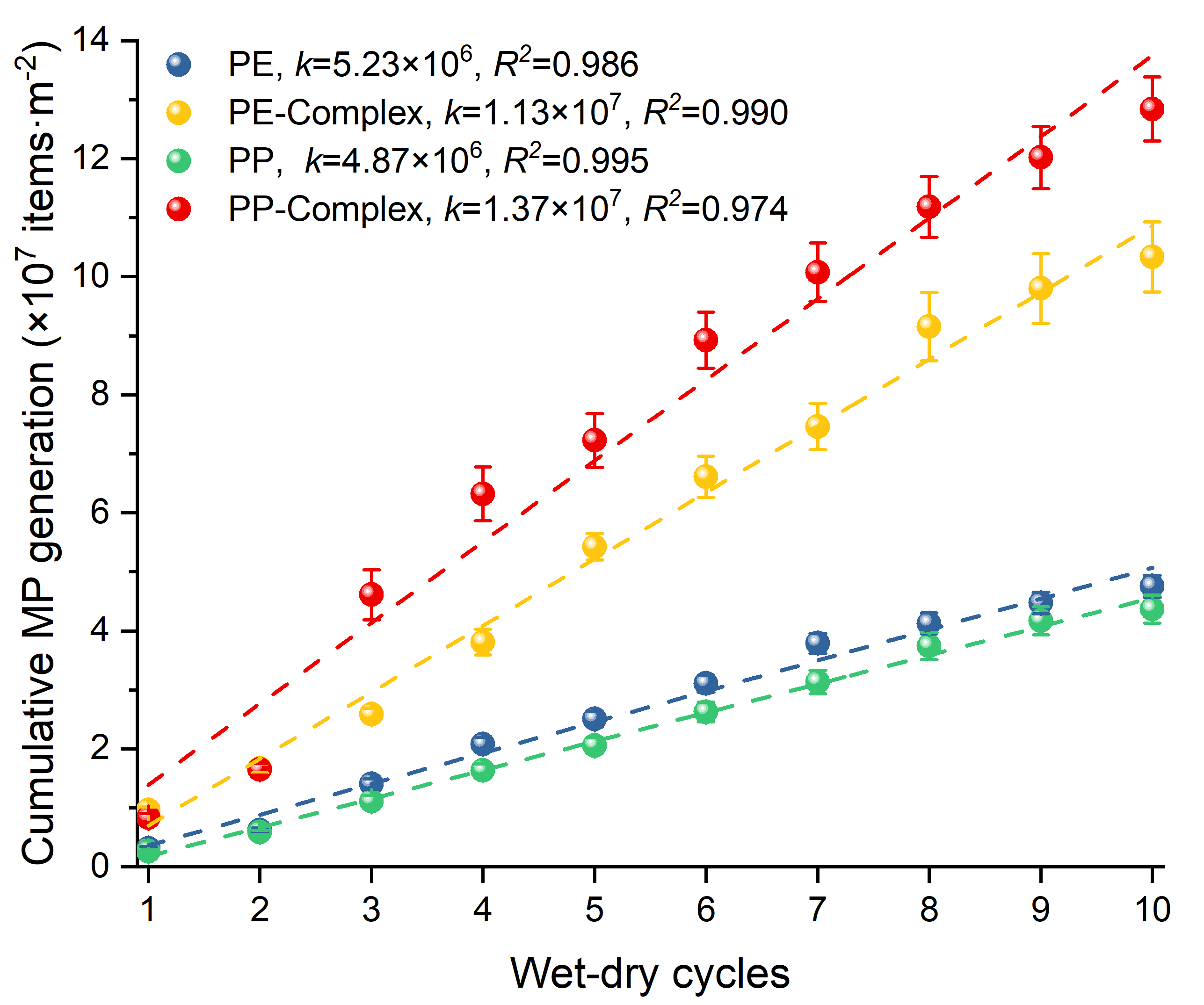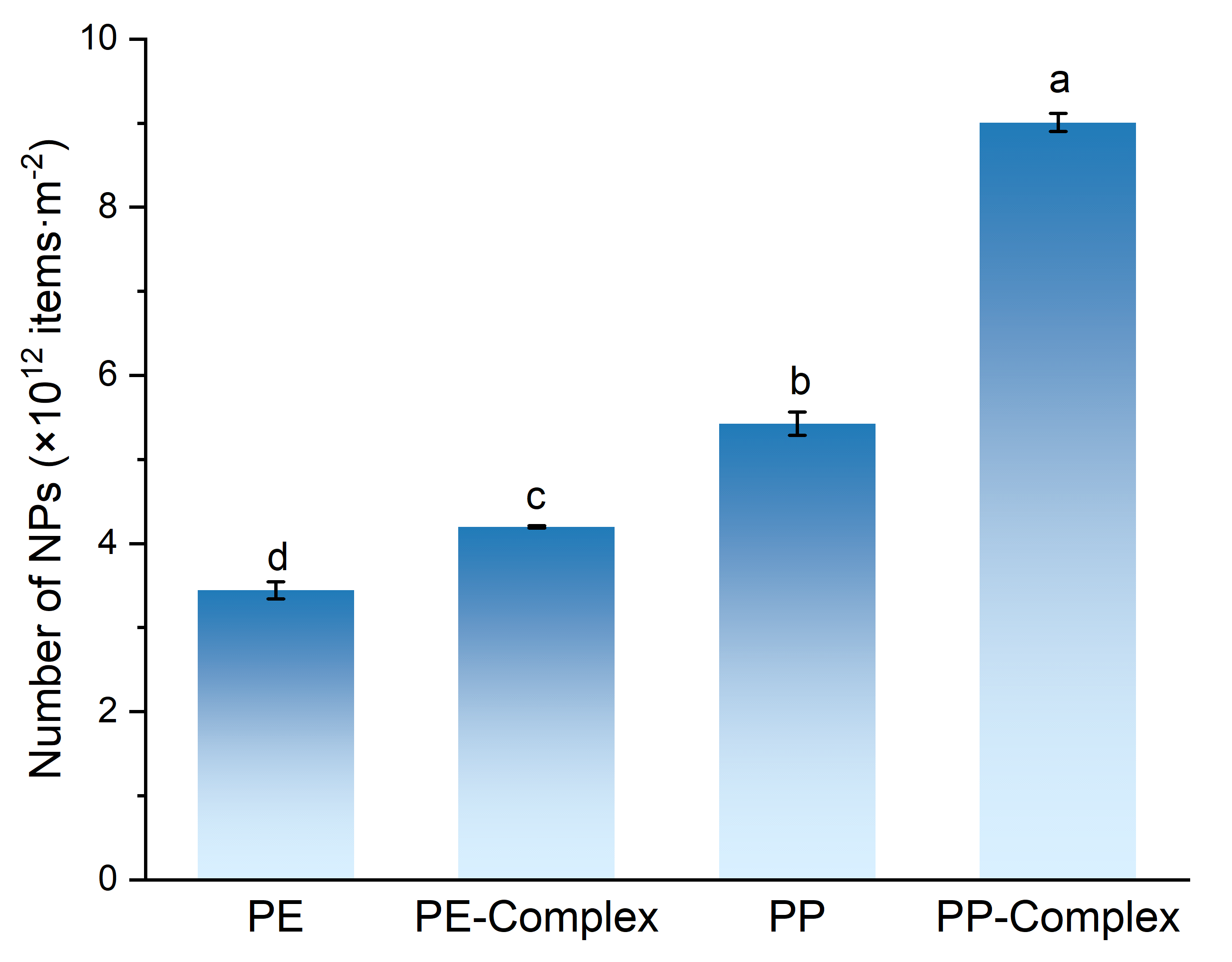 研究团队在实验室内通过干湿循环实验,探究了塑岩释放微纳米塑料的能力。与利用吹膜法制备的相同厚度塑料薄膜相比,相同循环次数下塑岩中的LDPE和PP可释放更多微塑料颗粒。微塑料的释放过程遵从零级动力学,显示出持续的微塑料释放能力。10次干湿循环过程中,LDPE与PP分别可累积释放1.03×108个/m2、1.28×108个/m2微塑料颗粒(图4),其释放速率比文献报告的垃圾填埋场、海洋环境下微塑料的释放速率高2个数量级以上(图5)。除此之外,干湿循环同样造成了纳米塑料的释放。NTA表征结果显示,单次干湿循环即可从塑岩结合的LDPE与PP中释放4.20×1012个/m2,9.01×1012个/m2纳米塑料颗粒(图6)。在全球变化的大背景下,洪水泛滥事件造成的干湿循环频次增加,这一塑料的赋存形式与其他赋存形式相比,存在较高的生态风险。这一发现是塑料这一人造材料进入自然界地质循环过程的直接证据,阐释了塑料制品在环境中一种新的风险机制与归趋。