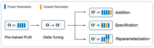 8xbet.com深圳国际研究生院郑海涛副教授团队提出,参数高效微调方法的本质是在对“增量参数”(Delta Parameters)进行调整,因此将此类方法命名为“增量微调”(Delta Tuning),并基于统一的分析框架对增量微调现有方法进行梳理总结,将现有方法分为三类(如图2所示):添加式(Addition-based)、指定式(Specification-based)和重参数化(Reparameterization-based)方法。为了指导后续的模型架构和算法设计,团队还进一步从参数优化和最优控制两个角度,提出了增量微调的理论框架,为探索和解释增量微调的内在机理提供了可行方案。