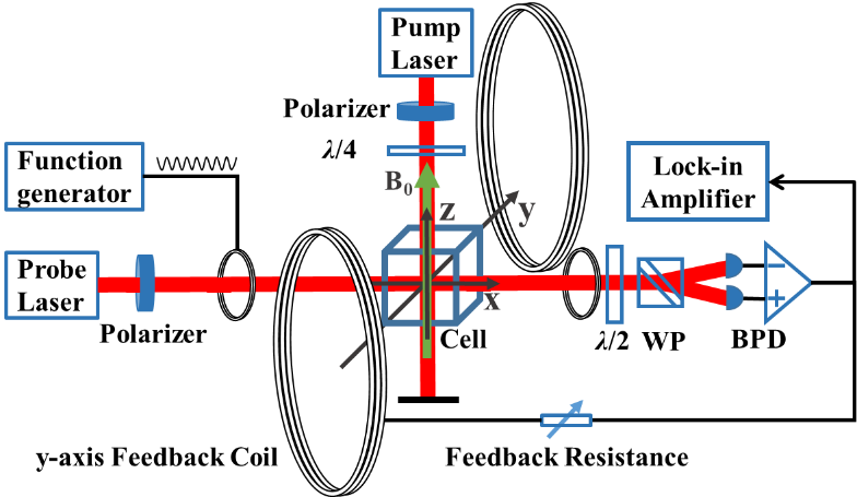 该工作在热原子系综中演示了PT对称型反馈方案。使用圆偏振光泵浦方法将原子系综的自旋极化,极化自旋矢量绕z方向磁场做拉莫尔进动,xy平面上的自旋分量(Px、Py)构成了有耗散的谐振模式。通过探测光穿过极化原子系综的顺磁法拉第旋光效应,实现对正交分量Px的测量。将测量得到的信息加载到反馈磁场线圈,产生的反馈磁场作用到原子系综,效果是在Px正交分量引入了增益,打破了Px、Py两个正交分量的对称性,使得集体自旋振子成为了PT对称系统。