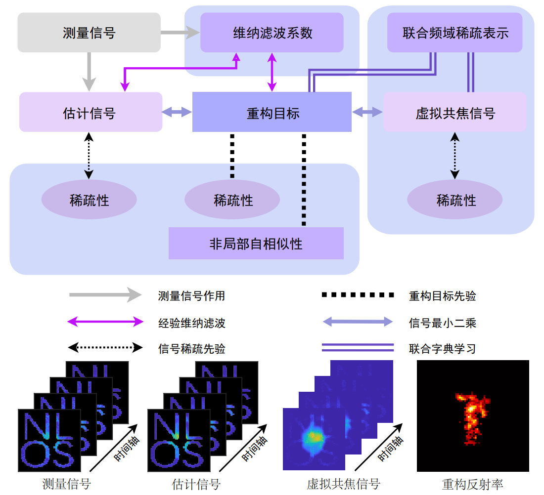 针对以上难题,研究团队提出了CC-SOCR重建方法,一举突破了传统非视域成像的场景范式,对于任意中介面形态(如图1b-1e所示的栅栏、百叶窗、窗框、异形结构等)均可实现准确成像。CC-SOCR方法基于贝叶斯推断,创造性地引入了虚拟共焦信号,并能够同时获取测量点处的低噪音估计信号、虚拟共焦信号及非视域目标的反射率与法向信息。同时,该方法发展和融合了稀疏优化、非局部自相似先验、双向正交字典学习、经验维纳滤波及联合频域稀疏表示等技术,具有优异的模型可解释性。图2展示了新方法的框架图及雕像实例的重构结果。其中,测量点限定于中介面上N、L、O、S字母内部区域。