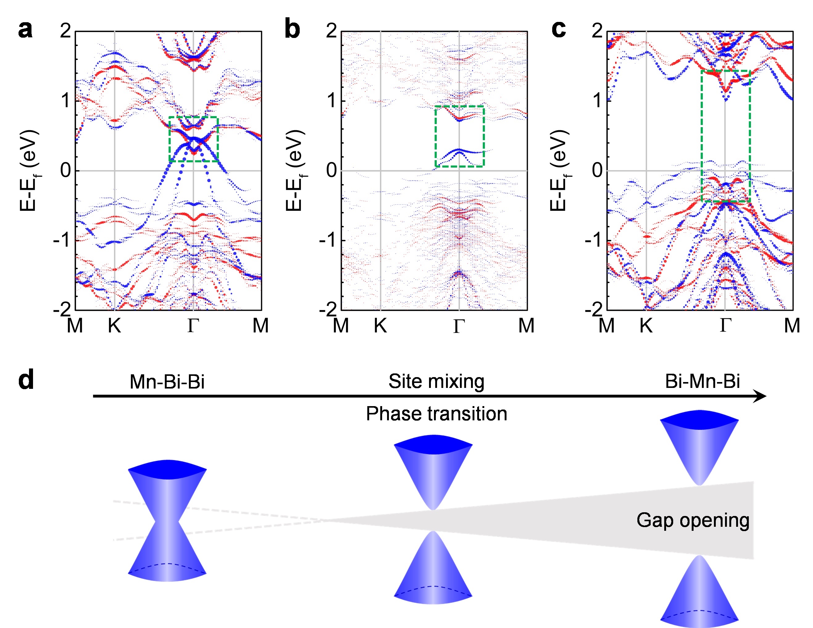 最后,课题组成员发现MnBi2Te4单层中狄拉克点相关能带的带隙会随着结构中MnBi和BiMn反位缺陷浓度的上升而减小,也即过高的MnBi和BiMn反位缺陷浓度会造成MnBi2Te4单层带隙的消失(如图3)。以上研究成果揭示了MnBi2Te4中MnBi和BiMn反位缺陷的形成和消失的机理,以及其在MnBi2Te4能带调控中扮演的角色,为实验中小带隙表面态的表征提供新的见解。
