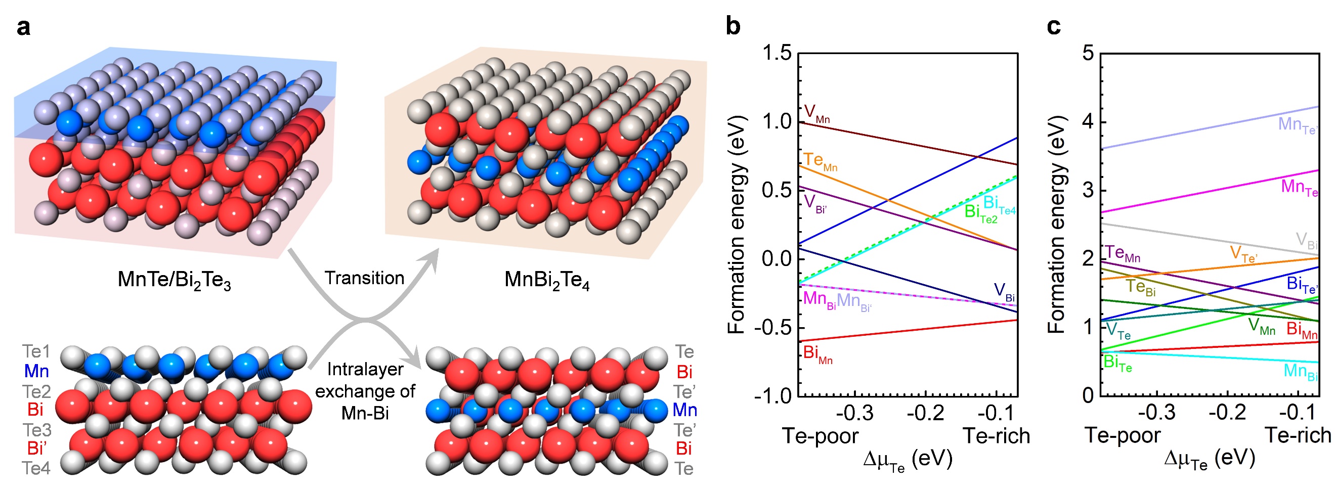 近日,8xbet.com深圳国际研究生院李佳课题组及合作者深入研究了MnBi2Te4制备的相变过程和相应的能带演化过程。首先,课题组成员选取MnTe/Bi2Te3和MnBi2Te4单层作为相变模型来研究其Mn-Bi交换的过程,并发现MnBi和BiMn反位缺陷是相变过程中的主要缺陷(如图1),与实验观察的结果一致。