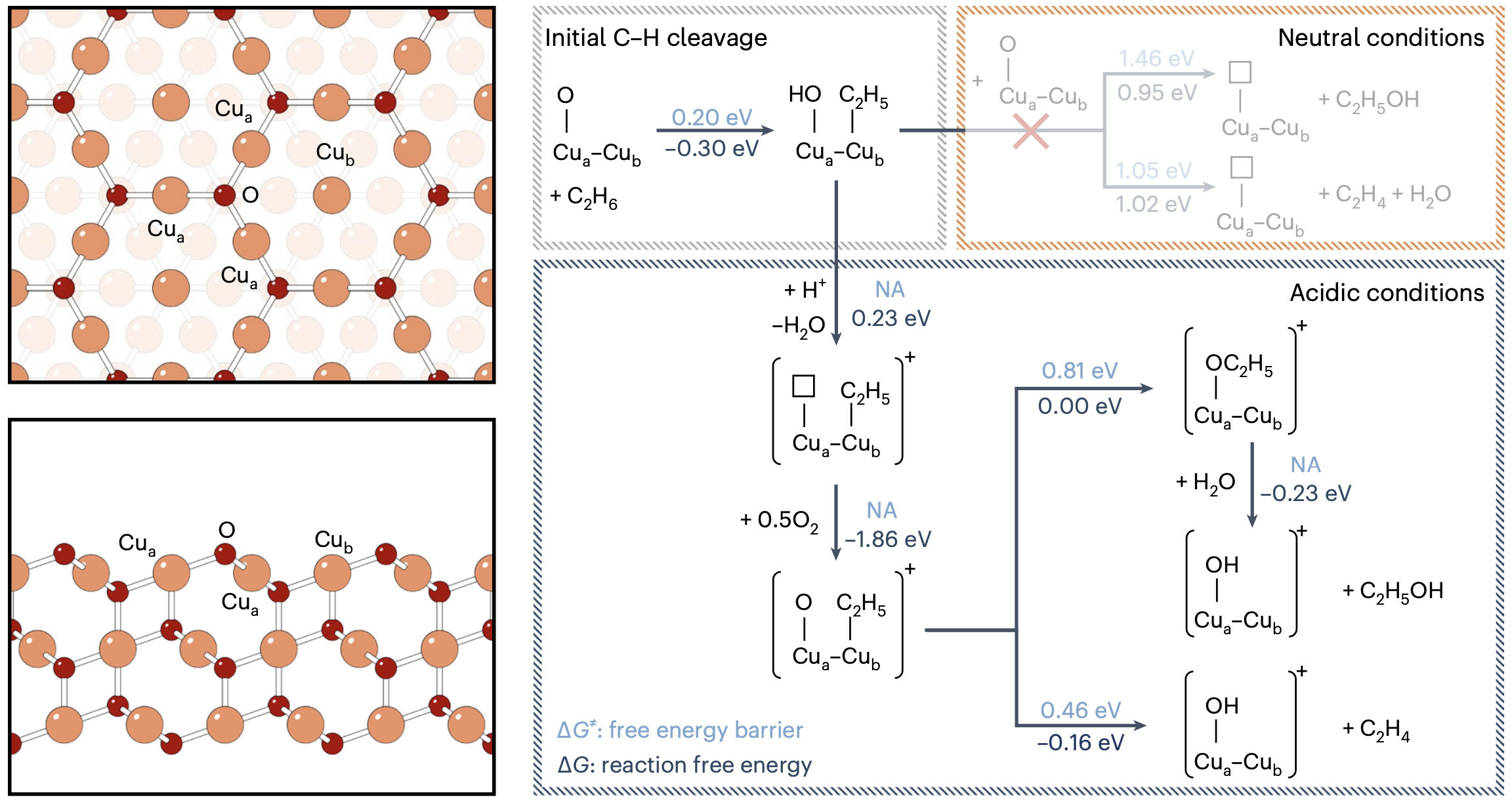 该团队利用同位素标记实验和原位表面增强拉曼光谱,深入探究了关键反应中间体的形成过程,提出了铜在反应条件下会生成表面氧化物,可实现烷烃的碳氢键断裂,生成吸附的烷基中间体。进而通过分子模拟和密度泛函理论计算,提出了可能的反应途径(图2)。